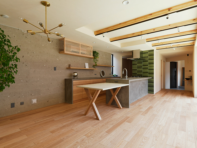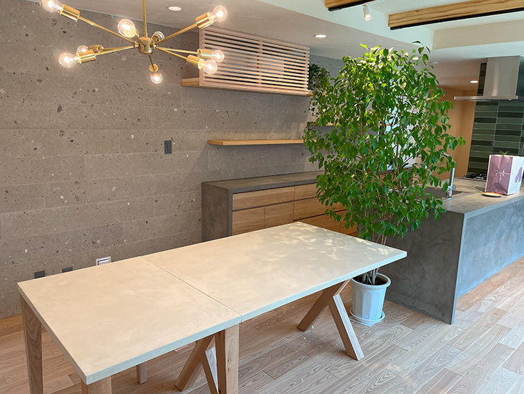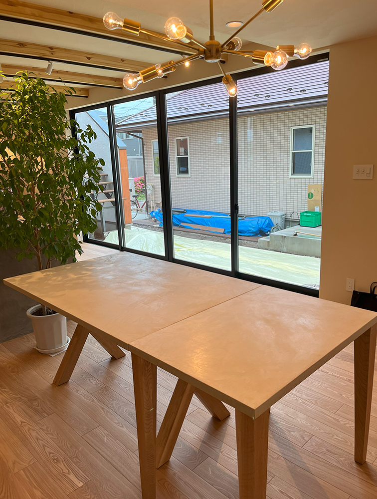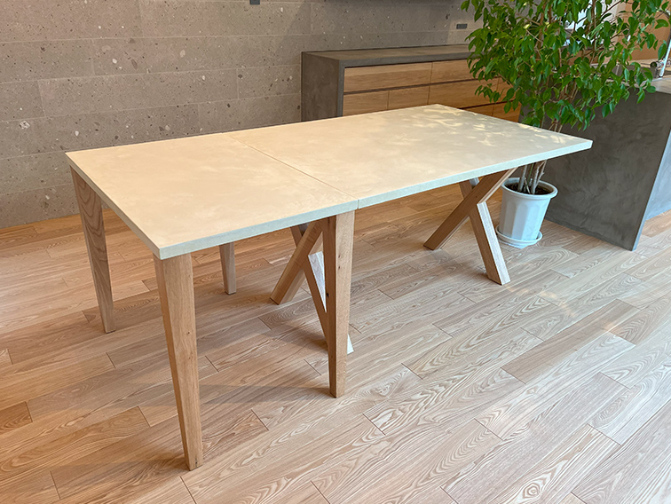 モールテックスの天板と オークの無垢の脚が、優しい印象に仕上がりました。